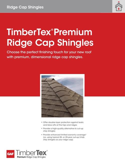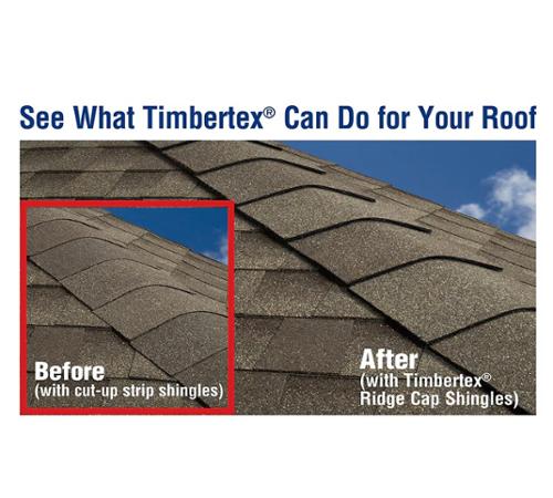 The perfect finishing touch for your new roof should be a distinctive and protective ridge cap shingle. TimberTex Premium Ridge Cap Shingles will accentuate the natural beauty of your newly installed GAF shingle roof. The special double-layer design adds depth and dimension to your roof that traditional single-layer ridge caps cannot provide, while offering critical protection at the high-stress areas of your roof (hips and ridges). TimberTex Premium Ridge Cap Shingles are specifically color-blended to complement your GAF shingles, unlike cut-up 3-tab shingles used as ridge caps.