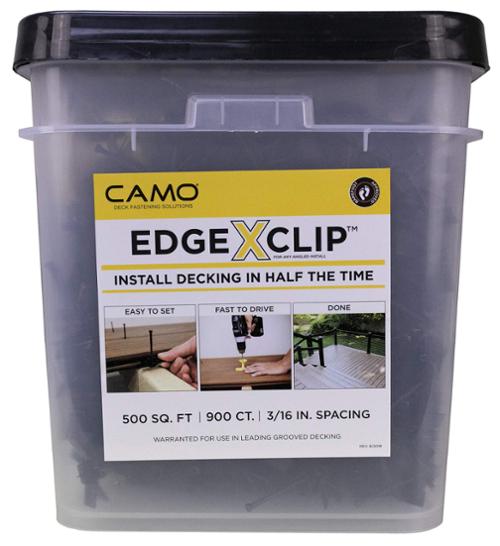 Any deck pattern on wood joists. One-pass fasteners—clip sits in the groove of the board until you’re ready to fasten. Clip body creates 3/16 in. (4.7mm) spacing. Gusset holds boards down. Fasten with included NEVER-MISS™ Guide or while standing up with the CAMO DRIVE™.